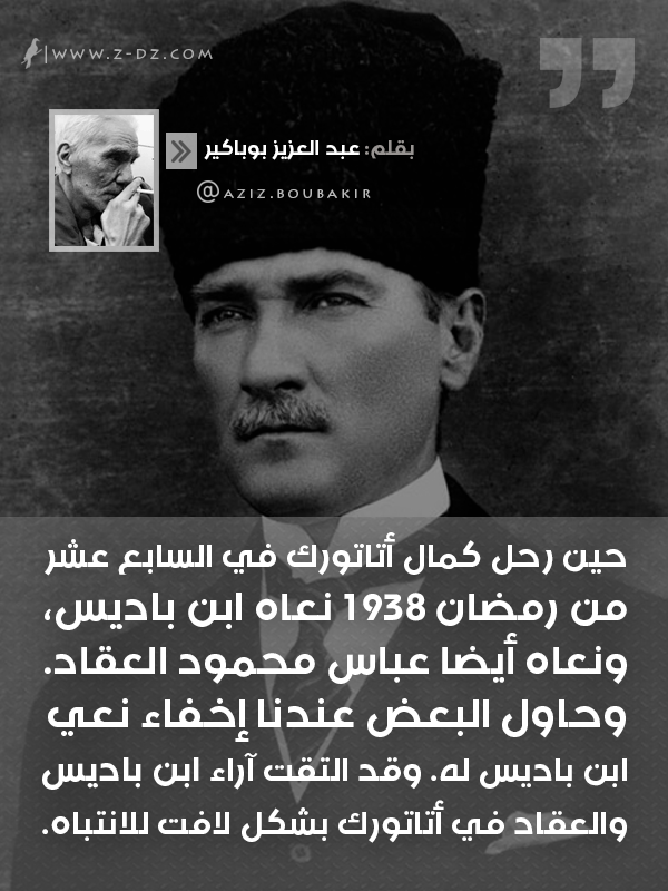 حين رحل كمال أتاتورك في السابع عشر من رمضان 1938 نعاه ابن باديس، ونعاه أيضا عباس محمود العقاد. وحاول البعض عندنا إخفاء نعي ابن باديس له. وقد التقت آراء ابن باديس والعقاد في أتاتورك بشكل لافت للانتباه. لم يبرّر ابن باديس ما قام به أتاتورك حين رفض مجلّة الأحكام. لقد كانت نظرة ابن باديس إلى مؤسس الدولة التركية الحديثة نظرة رجل مدرك للتغيرات العميقة التي أحدثتها في بلده وفي العالم الإسلامي. فهو، بالنسبة إليه، “أعظم رجل عرفته البشرية في التاريخ الحديث، وعبقري من أعظم عباقرة الشرق، الذين يتطلعون على العالم في مختلف الأحقاب، فيحوّلون مجرى التاريخ، ويخلقونه خلقا جديدا”. وأدرك ابن باديس أن ثورة أتاتورك لم تكن “ثورة على الإسلام، وإنما على هؤلاء الذين يسمون أنفسهم بالمسلمين، وعلى الخلافة الزائفة، وعلى شجرة زقوم الطرقية، وعلى جمود العلماء وعلى أعوان الانجليز”.